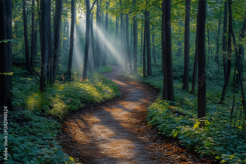 © AungThurein, Obraz premium A winding dirt path meanders through a dense, sunlit forest with towering trees, with rays of light filtering through the leaves