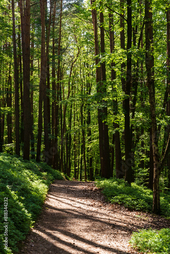 © AdobeTim82, Obraz premium A winding dirt path through a lush forest landscape