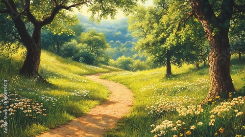 Naklejka premium A winding dirt path through a lush green meadow with trees on either side.