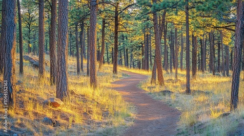 Fototapeta premium A winding dirt path through a pine forest, bathed in the golden light of sunset.