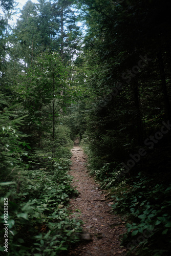 © reddish, Fototapeta premium A winding dirt path through lush greenery in a tranquil forest surrounded by tall trees during daylight hours