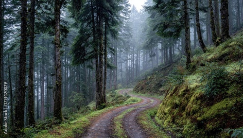 Fototapeta premium A winding, dirt road curves through a misty, evergreen forest. Tall trees...