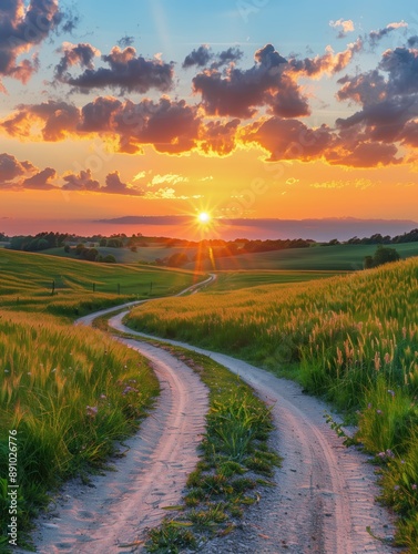 © K silver, Fototapeta premium A winding dirt road cuts through a vibrant green meadow towards a breathtaking sunset, painting the sky with fiery orange and pink hues