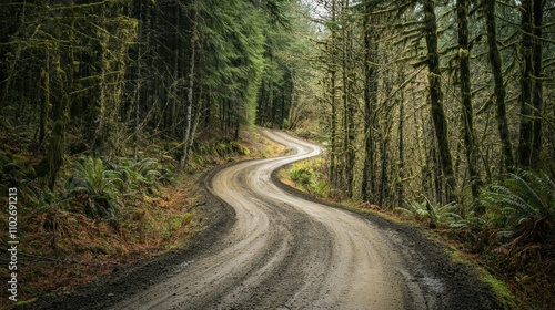 Fototapeta premium A winding dirt road cutting through a dense forest, inviting adventure and...