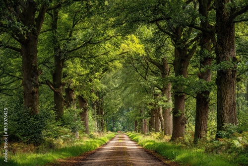 Fototapeta premium A winding dirt road is framed by towering trees, creating a tunnel effect in...