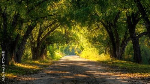 © Ketut Suki, Obraz premium A winding dirt road leads through a tunnel of trees.
