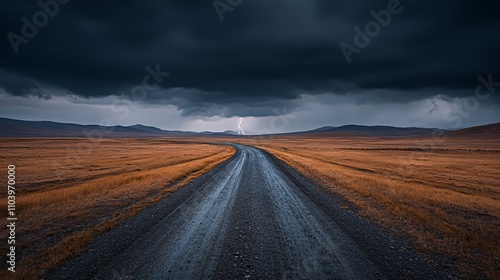 © danadesa, Fototapeta premium A winding dirt road leads through a vast landscape under dark, stormy skies with lightning.