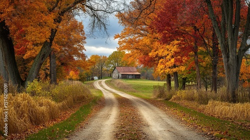 Obraz premium A winding dirt road leads to a rustic cabin surrounded by vibrant autumn...