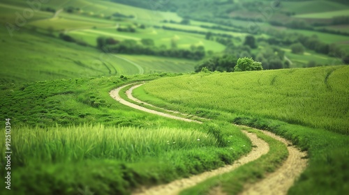 Fototapeta premium A winding dirt road meanders through lush green fields, inviting exploration...
