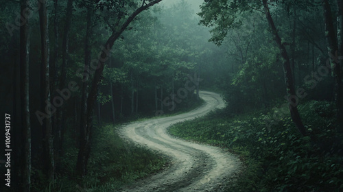 Fototapeta premium A winding dirt road that disappears into a dark forest filled with ominous...