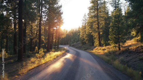 © twilight mist, Fototapeta premium A Winding Dirt Road Through a Forest at Sunset