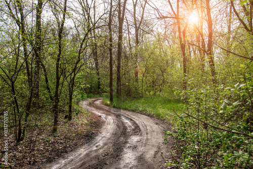 © Олег Кононов, Naklejka premium A winding dirt road through a lush deciduous forest in spring, captured after a rain. The wet path adds texture, with fresh greenery and tall trees surrounding the serene nature scene