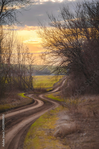 © Kykes_, Fototapeta premium a winding dirt road through leafless trees and green hills, against a bright orange sunset sky