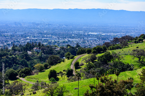 © MichaelVi, Naklejka premium A winding dirt trail bordered by fencing cuts through green hills with scattered trees, overlooking Downtown San Jose skyline and the surrounding suburban sprawl from Alum Rock Park