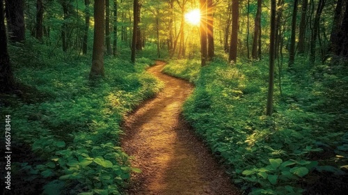 Fototapeta premium A Winding Forest Path Bathed in the Golden Glow of a Radiant Sunburst