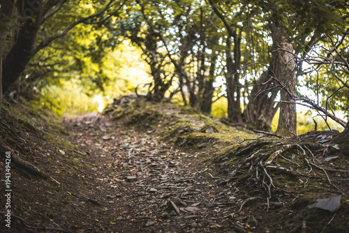 Fototapeta premium A winding forest path covered in stones and fallen leaves leads through lush green trees, Peak District National Park
