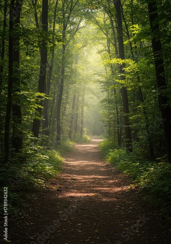 Fototapeta premium A winding forest path dappled with sunlight creates a beautiful, serene, and...