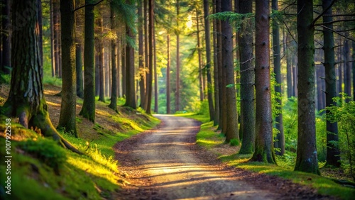 Naklejka premium A winding forest path disappearing into the trees with bokeh effect from a...