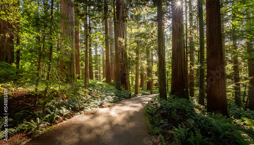Fototapeta premium a winding forest path surrounded by tall trees and dappled sunlight serene and encouraging