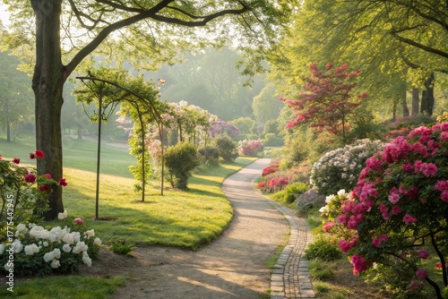 © MohamadIzzudin, Fototapeta premium A winding garden path with blooming flowers in bright daylight