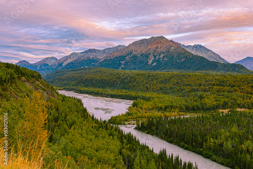 © Zhiqi, Fototapeta premium A winding glacial river cuts through dense boreal forest at golden hour along the Glenn Highway from Valdez to Anchorage, with sunset-lit Chugach Mountains glowing under pastel skies in early fall.