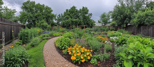 Fototapeta premium A winding gravel path leads through a lush, flowering garden with a wooden fence and green trees in the background.