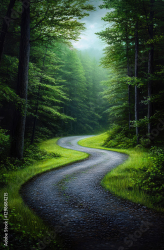 © Narongsak, Obraz premium A winding gravel path meanders through a tranquil forest, embraced by lush greenery and soft, ethereal light filtering through the trees, inviting exploration and reflection.
