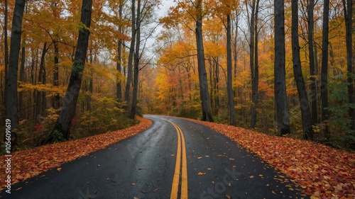 Obraz premium A winding mud road leads through a dense autumn forest, illuminated by the warm glow of vibrant red, orange, and yellow leaves. Fallen leaves carpet the road, adding depth and richness to this serene