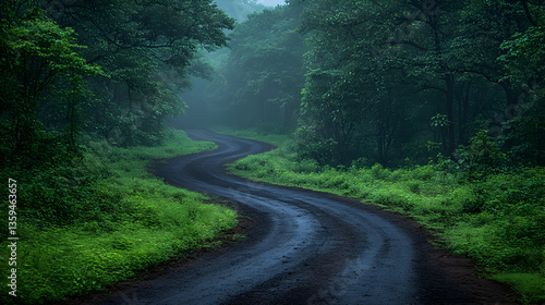 © indasah, Fototapeta premium A winding path disappears into a dense forest of verdant trees under a sky draped in mist inviting exploration and intr