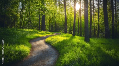Fototapeta premium A winding path in a beautiful forest morning time.