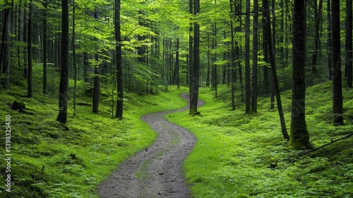 © Berkah1789, Obraz premium A winding path leads through a lush green forest landscape