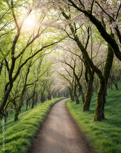 © zabhie, Obraz premium A Winding Path Leads Through a Mossy Forest with Delicate Cherry Blossoms in Bloom. Nature Photography
