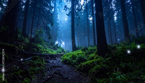 Fototapeta premium A winding path leads through a mystical, dimly lit forest, bathed in a soft,...