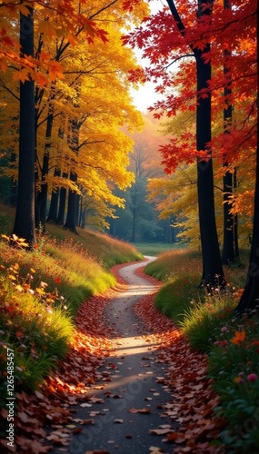 Fototapeta premium A winding path leads through a tapestry of fall colors, winding path, nature...
