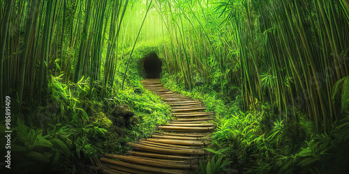 Fototapeta premium A winding path through a bamboo forest, leading to a hidden grotto.