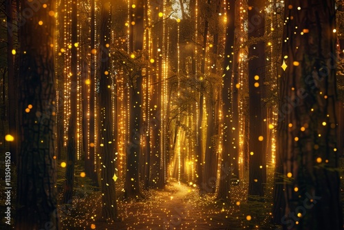 Fototapeta premium A winding path through a dense forest glows with countless sparkling lights,...