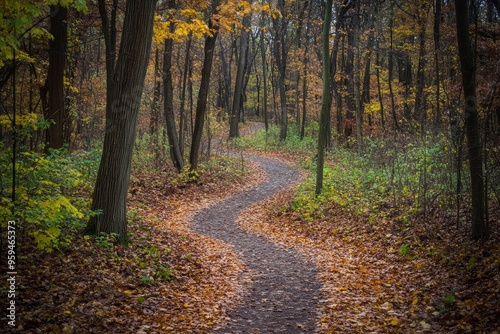 © adri, Obraz premium A winding path through a forest in autumn, covered in fallen leaves.