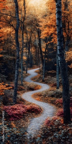Fototapeta premium A winding path through a forest with vibrant autumn foliage. The sunlight filters through the trees, creating a magical atmosphere.