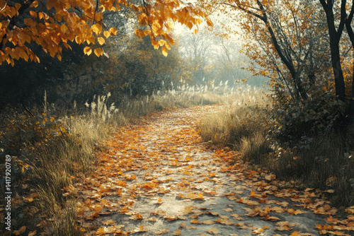 © Shakhnoza, Obraz premium A winding path through a forest with vibrant yellow leaves under the soft sunlight, creating a serene autumn setting.