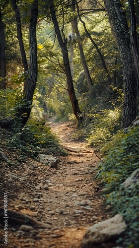 Obraz premium A winding path through a lush forest, sunlight filtering through the canopy,...
