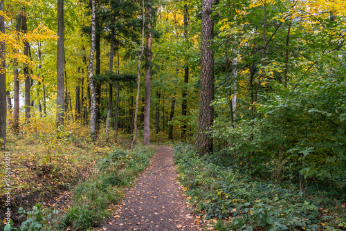 Fototapeta premium A winding path through a lush forest with trees displaying vibrant autumn foliage during daytime in outdoor nature setting.