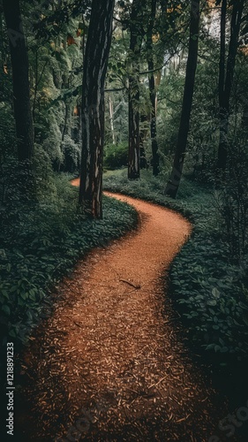 Fototapeta premium A winding path through a lush green forest, surrounded by dense trees and foliage, inviting exploration and tranquility.