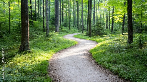 Fototapeta premium A winding path through a lush green forest, surrounded by tall trees and vibrant foliage, inviting exploration and tranquility.