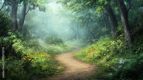 © B 7 YOU, Fototapeta premium A winding path through a lush green forest with a misty atmosphere.