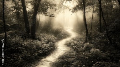 Fototapeta premium A winding path through a misty forest, illuminated by a faint light.