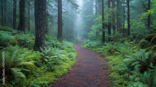 Obraz premium A winding path through a misty, green forest with tall trees and ferns on...