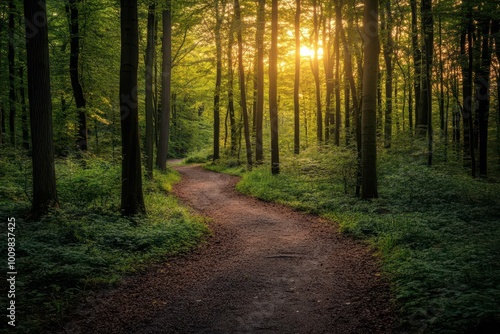 Naklejka premium A winding path through a serene forest at sunset, inviting exploration and...