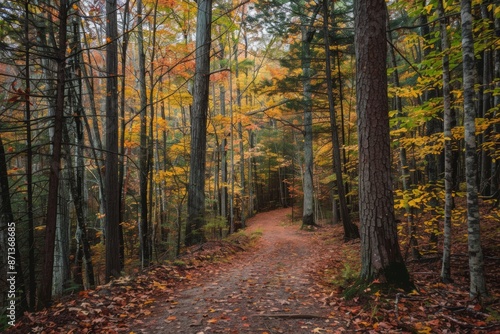 Obraz premium A winding path through a vibrant autumn forest, with trees displaying golden...