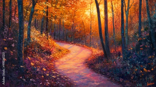 © Wish Craft Arts, Fototapeta premium A winding path through an autumn forest with golden light filtering through the trees.