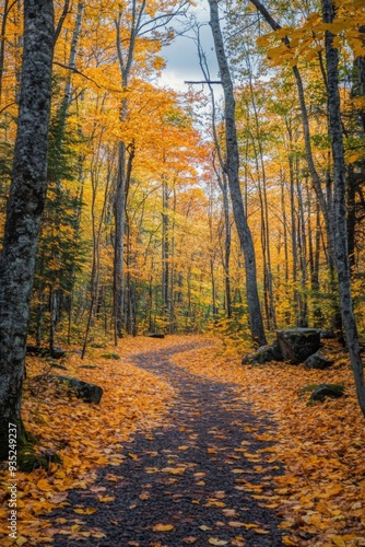 Fototapeta premium A winding path through an autumn forest with vibrant yellow and orange leaves...